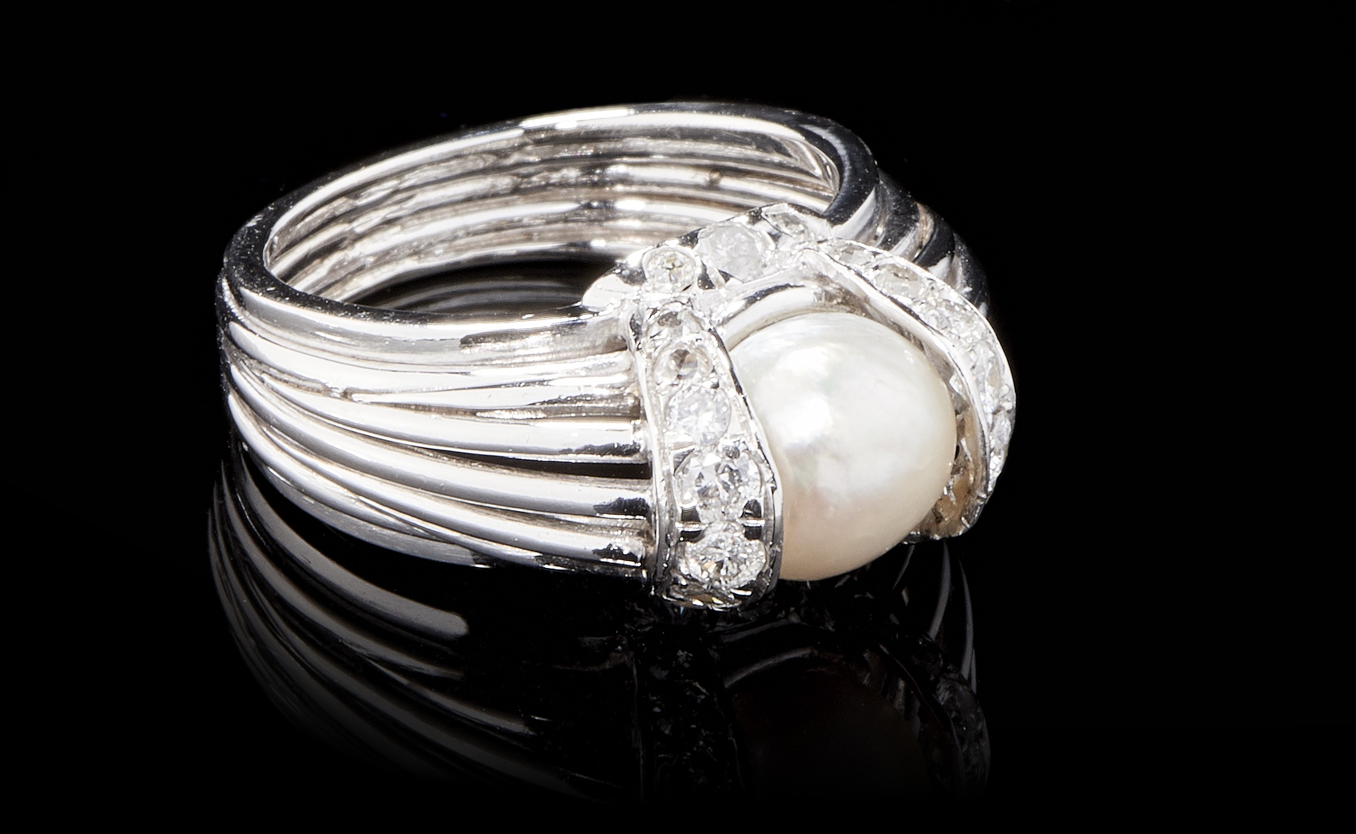 Bague sertie d'une perle rehaussée de diamants Or gris 750, doigt 54-14, 10 g