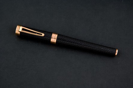 made of rubber gum simulating an automobile wheel with rings and rose gold clip. Gold nib. Load converter and cartridges. Used.