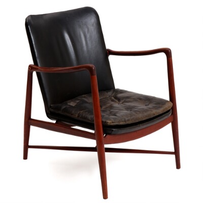 Easy chair with solid teak frame, upholstered with grey and red wool.