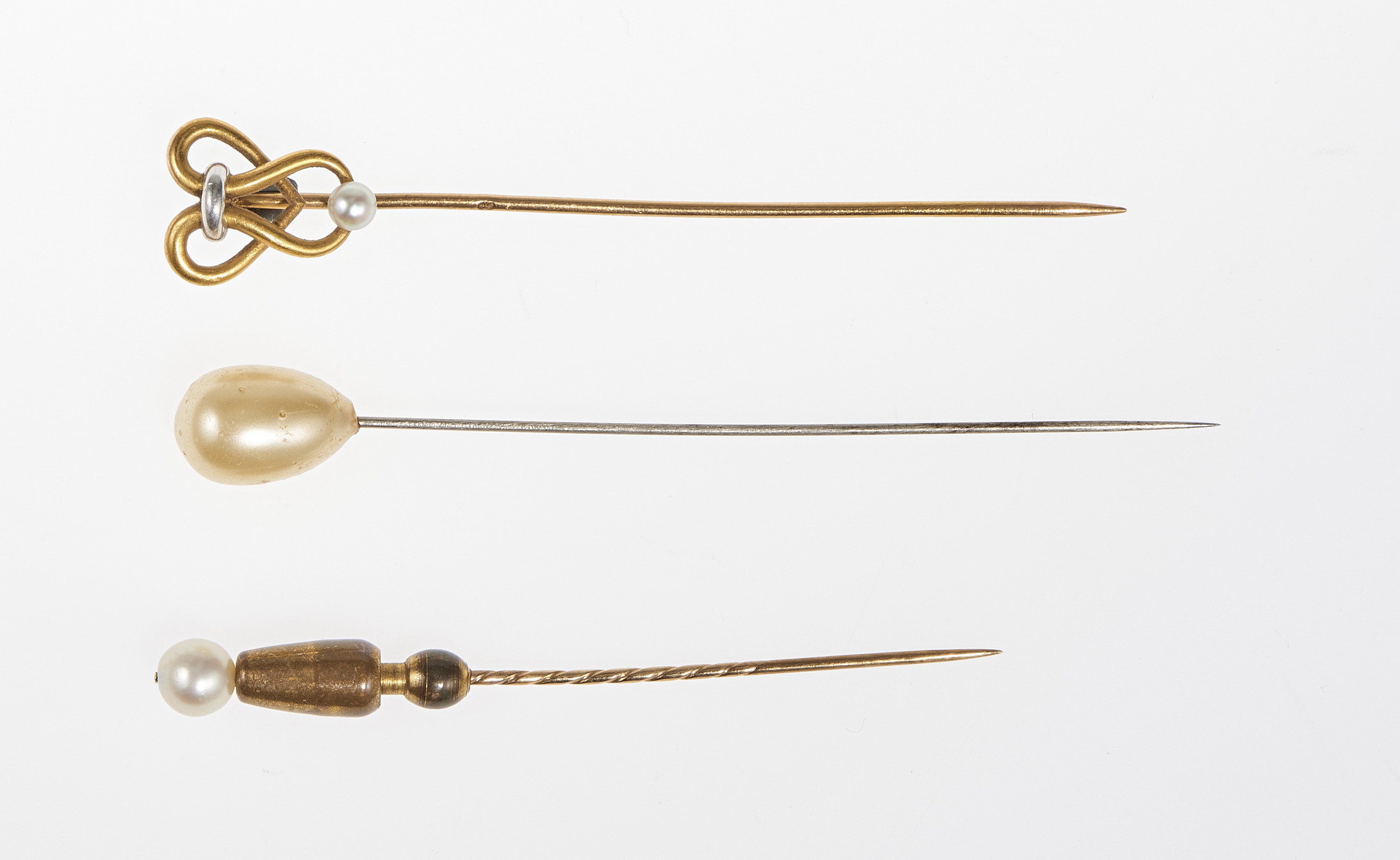 Gold 750, W 7 cm, 3 g. We attach a pin set with a 585 gold bead and a metal pin set with a pearl.