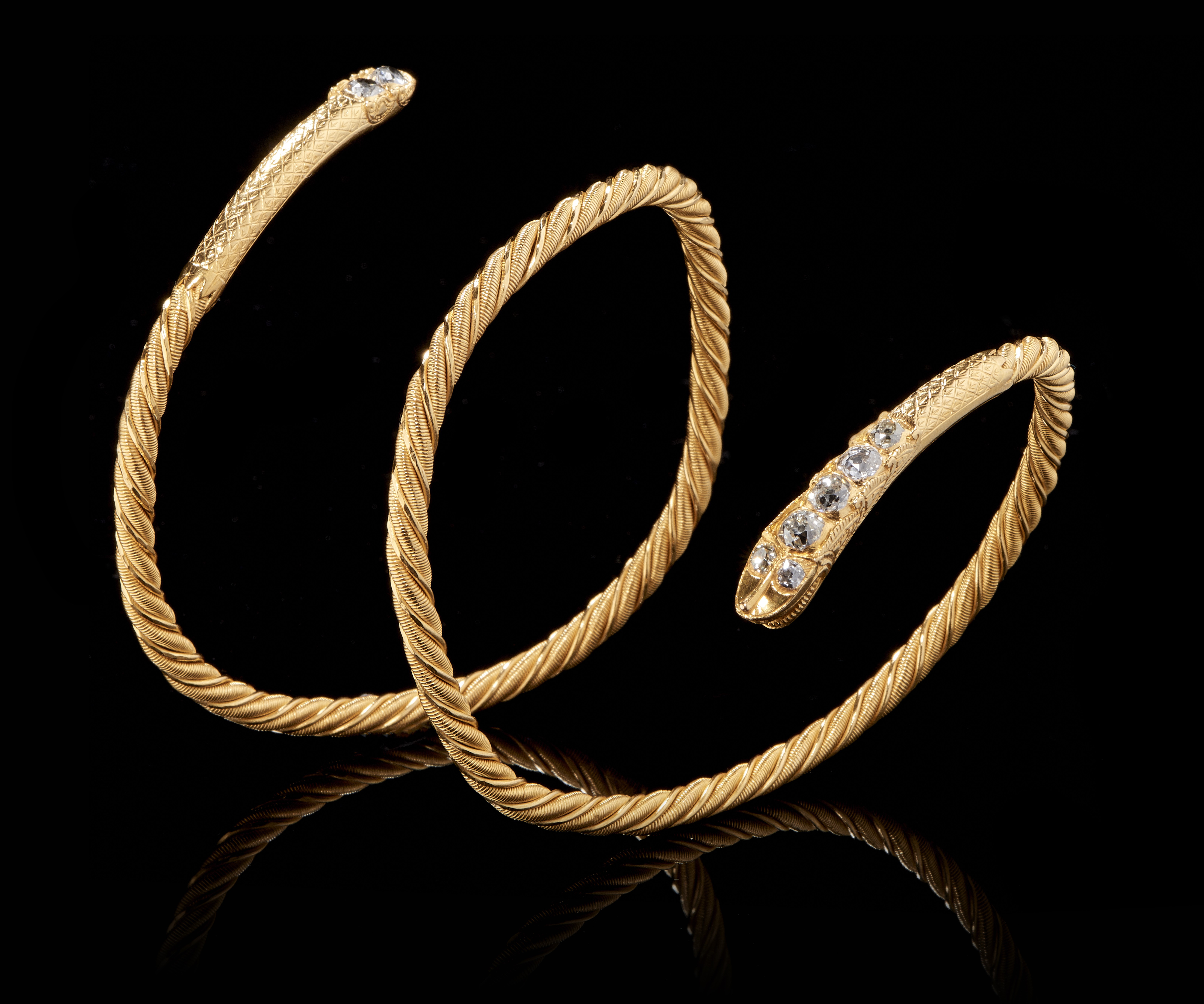 Bracelet serpent à la tête et la queue serties de diamants taille ancienne (env. 2 ct)