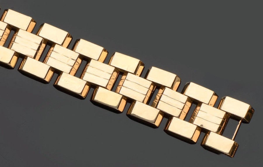 Bracelet "Tank" in yellow gold, system and safety chain, length: 19 cm, perfect condition, around 1950, weight: 55,4gr. gross