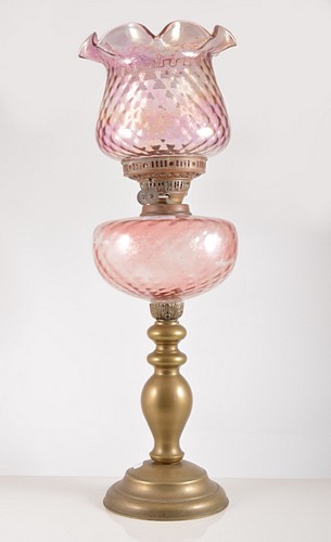 Brass oil lamp, pink tinted moulded reservoir, shade