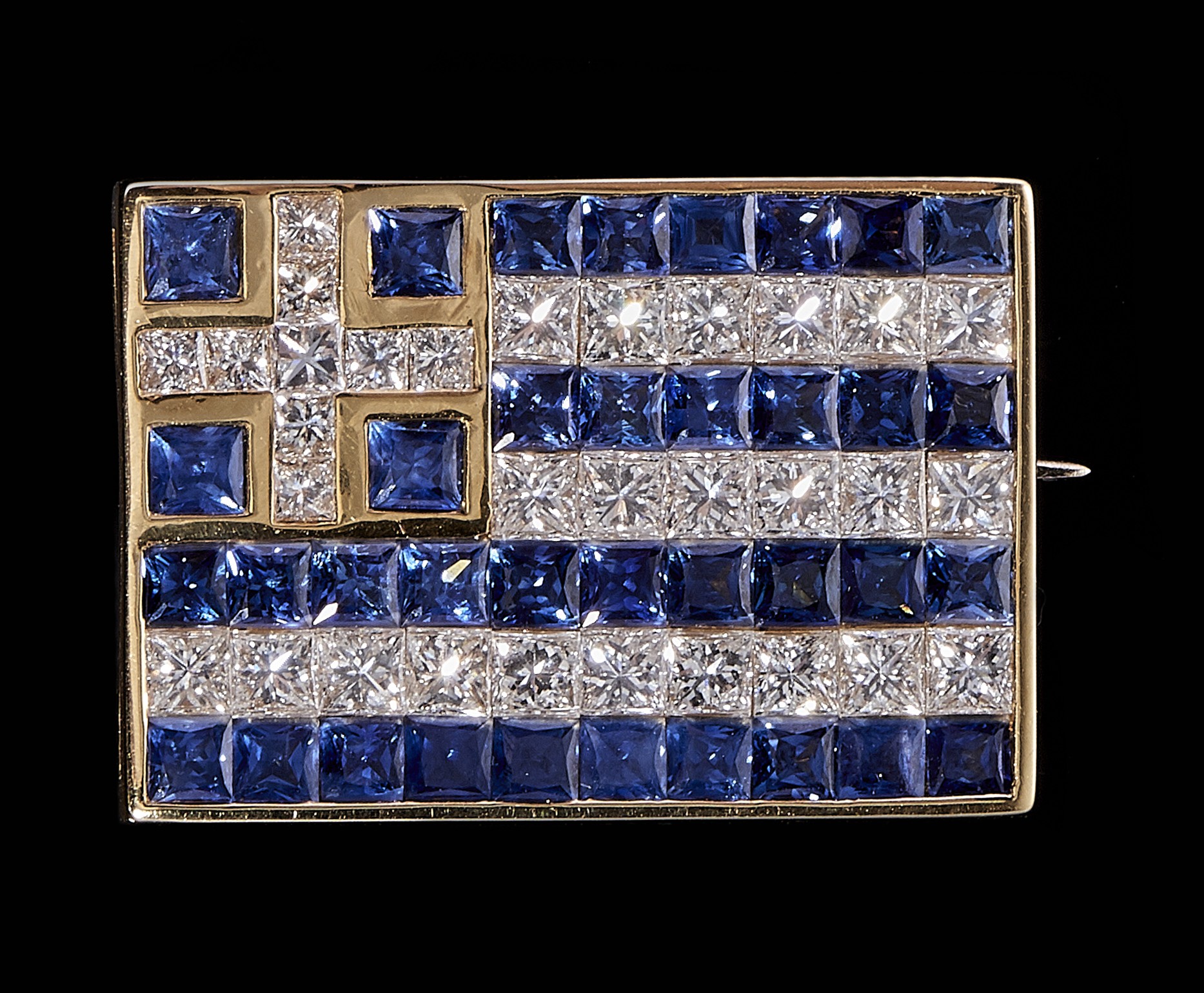 Broche à motif du drapeau grec sertie de saphirs et de diamants