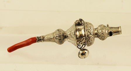 A MID 19TH CENTURY EMBOSSED SILVER AND CORAL INFANTS RATTLE