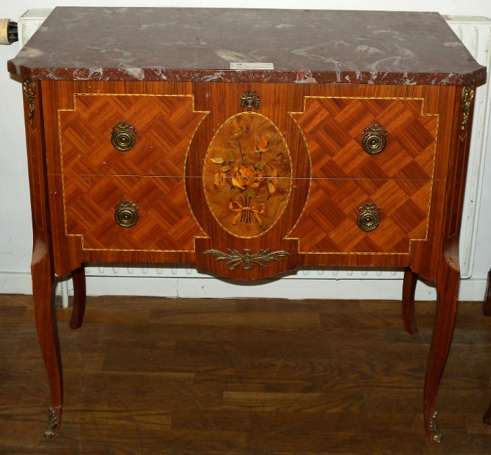 Gustavian style, with marble top, brass fittings and inlay. Height 76, depth 43 and width 79 cm. Some surface damage