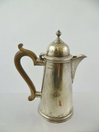 C.S. HARRIS & SONS A QUEEN ANNE STYLE SILVER HOT WATER POT having hinged domed lid with knop on a tapered conical body, London 1914, 383g