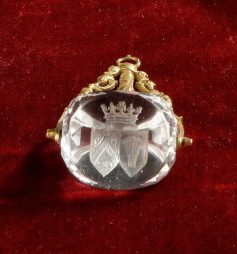 En or et cristal, gravé d’armoiries surmontées d’une couronne de marquis. La prise à décor de sphynges. Poids brut 17 g On y joint un cachet en or orné d’une pierre orange, fin du XIXe siècle (poids brut 3 g).