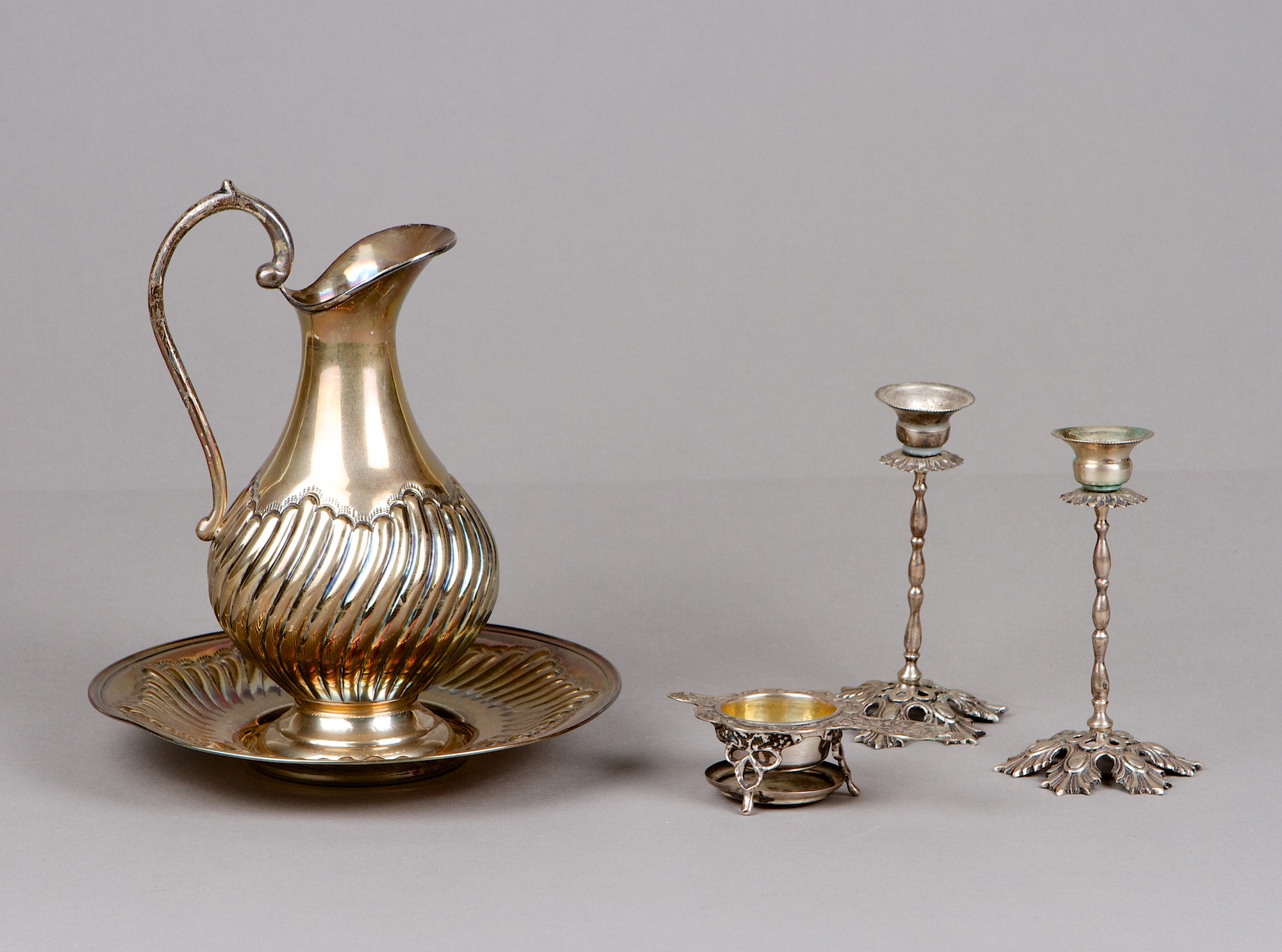 Carafe, dish, tea strainer and a pair of candlesticks