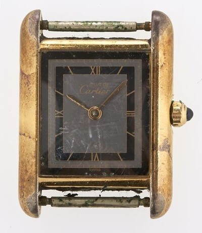Black dial, golden hands and Roman numerals, winding set with sapphire cabochon, vermeil