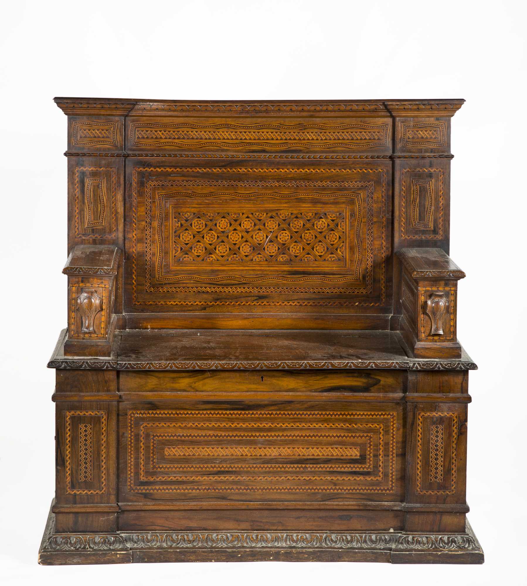 Intricate inlaid walnut back, sides and front panel with a pine lift up seat to reveal a storage area