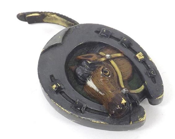 Cast metal vesta case in the form of a horse's head within a horseshoe