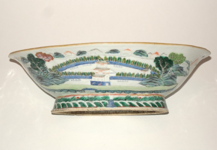 Prolonged fyrpassform on foot. Porcelain with painting in colors depicting Teng Wang Ge, Nanshang. Quick Pages with signs written, the approximate meaning "Western mountain wearing several shades of green," and "There are many boats returning home in
