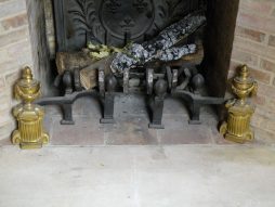 Chenets en bronze ciselé et doré à décor d’un vase sur piédouche, cannelé, on y joint une pelle et une pince et un pare-feu.