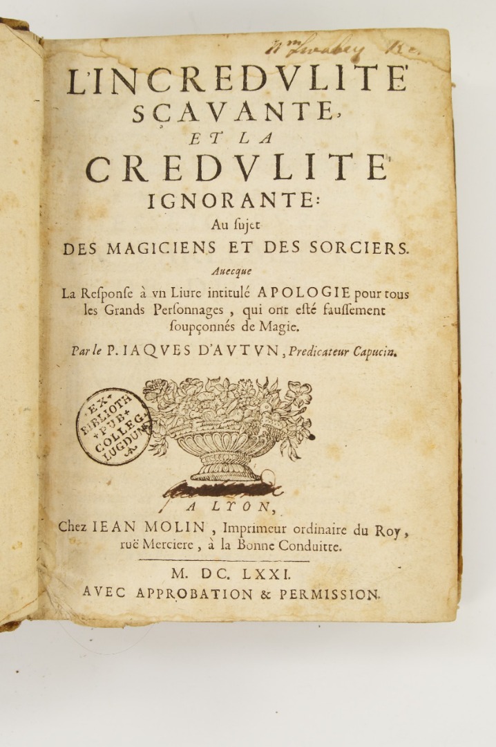L'Incredulité Scavante et la Credulité Ignorante: au sujet des Magiciens et des Sorciers, FIRST EDITION, woodcut device on title, woodcut head- and tail-pieces and initials, contemporary ink ownership inscriptions on front free endpaper and tile, ear