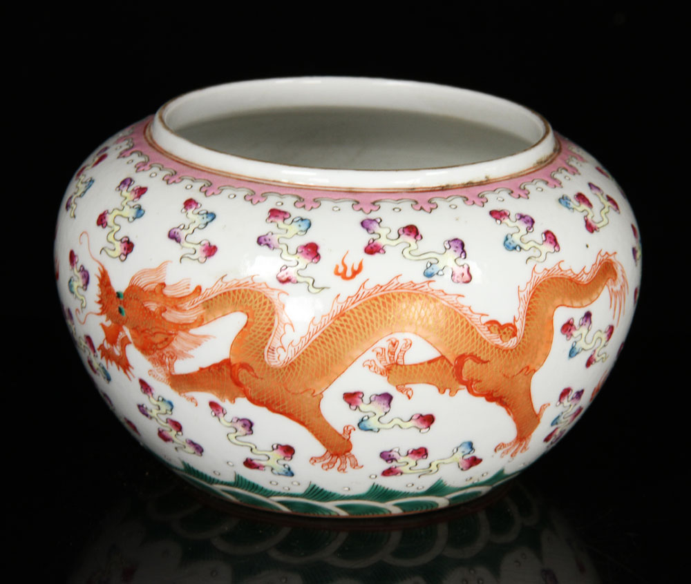 Famille rose porcelain brush washer, decorated with dragon and cloud pattern