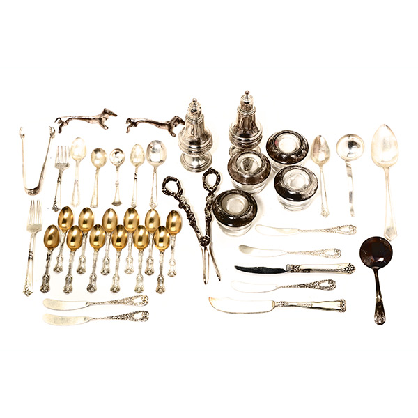 Comprising twelve Whiting demitasse spoons with gilt bowls; a pair of Tuttle dog form knife rests; five butter knives; a six piece Heirloom Damask Rose child's flatware set; a Porter Blanchard gravy spoon; together with a pair of weighted salts; a pa