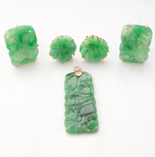 Including one carved and pierced jadeite plaque measuring approximately 32.5 x 14 mm, set with a 10k yellow gold bail; a pair of circular carved jadeite, 14k yellow gold stud earrings together with a pair of carved jadeite arch, 14k yellow gold earri