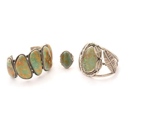 Including one ovoid shaped turquoise cabochon, silver leaf motif cuff bracelet; a five ovoid shaped turquoise cabochon, sterling silver cuff bracelet, signed "KS" together with an oval turquoise cabochon, silver ring, size 10 1/4. {Gross Weight: 124.