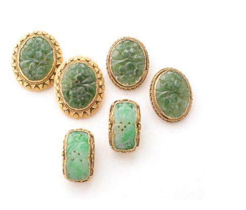 Including one pair of carved and pierced jadeite, silver-gilt non-pierced earrings measuring approximately 27 x 22 mm; one pair of carved and pierced jadeite, silver-gilt non-pierced earrings measuring approximately 23 x 18.5 mm together with a pair