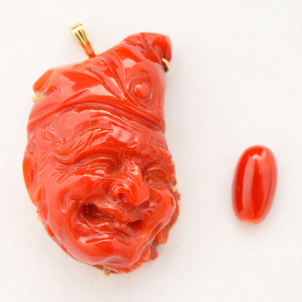 Including a carved coral face of grimacing man measuring approximately 38 x 24 mm, set in a 14k yellow gold mounting together with an unmounted oval coral cabochon measuring approximately 12.6 x 6.9 mm.