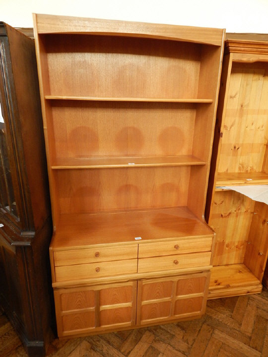 with two shelf open rack, four frieze drawers, pair of panel cupboards below