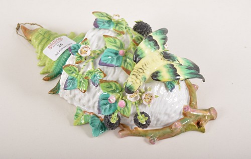 Continental porcelain wall pocket, designed as a birds nest, applied bird and flowers, unglazed blue mark TR, length 36cm.