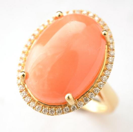 Centering one oval coral cabochon measuring approximately 18.1 x 13.2 mm, surrounded by forty-four full-cut diamonds weighing a total of approximately 0.25 cttw., set in a 14k yellow gold mounting. {Size 7, Gross Weight: 5.3 dwts}