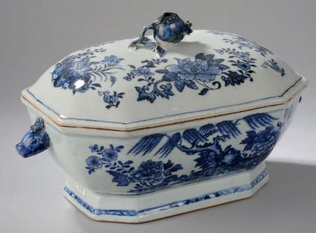 Covered terrine Company gripping stud in Indian grenade and side handles to blue in white porcelain decorated boar heads cobalt