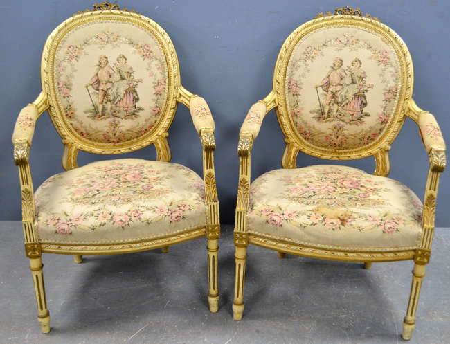 Cream and gold painted pair of armchairs with embroidered back and seats