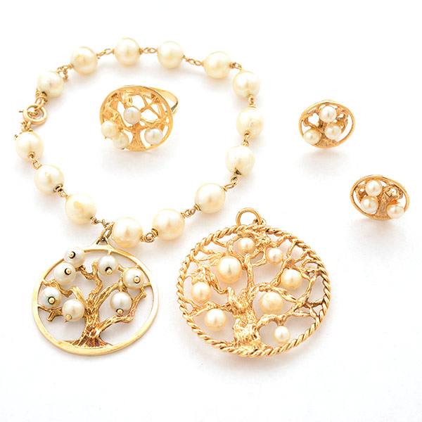 Including one cultured pearl, 14k yellow gold, 7 1/2 inch bracelet featuring a circle tree charm; one matching cultured pearl, 14k yellow gold circle tree pendant; a matching cultured pearl, 14k yellow gold circle tree ring, size 9 together with a ma