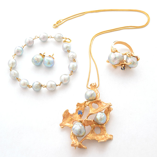 Including one baroque cultured pearl, sapphire, 14k yellow gold abstract pendant necklace; one matching baroque cultured pearl, sapphire, 14k yellow gold ring, size 8 1/2; one pair of baroque cultured pearl, 14k yellow gold stud earrings together wit