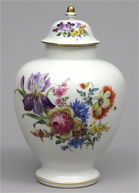 Eiförmige Laibung, schauseitig mit bunter Blumenbouquetmalerei, Goldränder. Boden mit kl. Glasurfehler. Schwertermarke Meissen, Mitte 20. Jh. 1. Wahl. H. 30 cm.