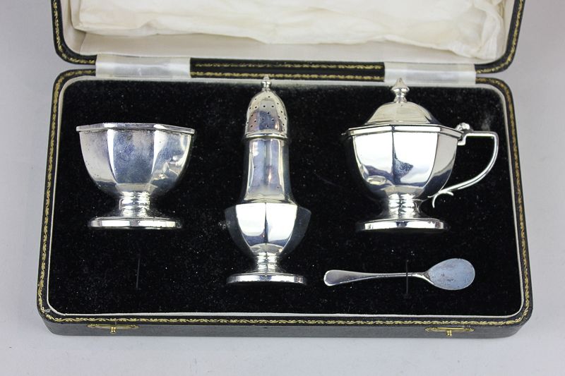 A George VI silver cruet of salt, pepper and mustard, with blue glass liners (one a/f), in a fitted box