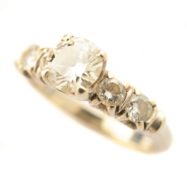 Centering one old European-cut diamond weighing approximately 0.65 ct., flanked by four full-cut diamonds weighing a total of approximately 0.30 cttw., set in a 14k white gold mounting.