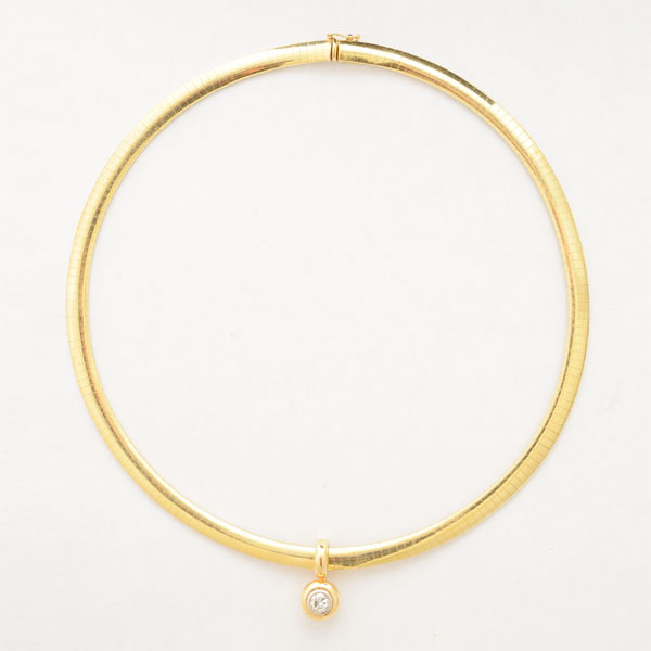 Featuring one round brilliant-cut diamond weighing approximately 0.50 ct., bezel set in a 14k yellow gold pendant slide mounting, suspended from a 14k yellow gold, curved flat link measuring approximately 6 mm in width, completed by a tongue and groo