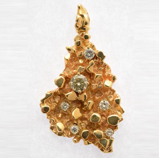 Featuring six full-cut diamonds weighing a total of approximately 0.60 cttw., set in a 14k yellow gold nugget style pendant. {Gross Weight: 7.8 dwts}