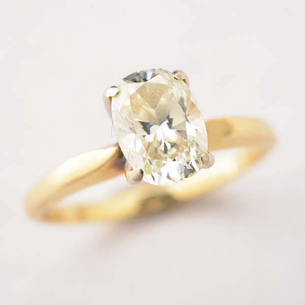 Featuring one oval-cut diamond weighing approximately 1.02 ct., set in a 14k yellow gold mounting. {Size 6 1/4, Gross Weight: 1.7 dwts}