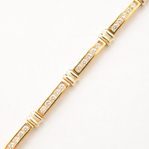 Featuring fifty full-cut diamonds weighing a total of approximately 2.25 cttw., set in an 18k yellow gold mounting, completed by a tongue and groove clasp with figure eight safety, forming a 7 1/4 inch bracelet.