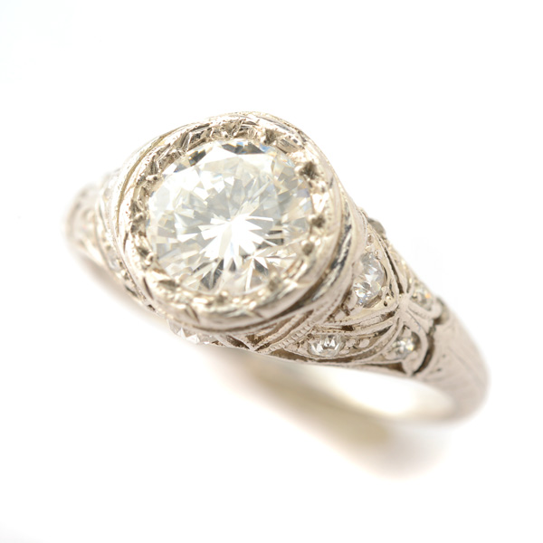 Centering one round brilliant-cut diamond weighing approximately 1.00 ct., accented by twelve round-cut diamonds weighing a total of approximately 0.10 cttw., set in a platinum mounting. {Size 6 3/4, Gross Weight: 2.9 dwts}