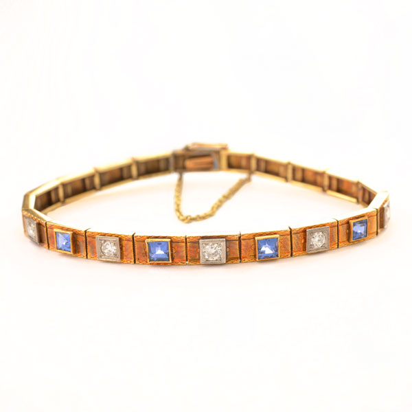Diamond, Synthetic Sapphire, 14k Yellow Gold Bracelet.