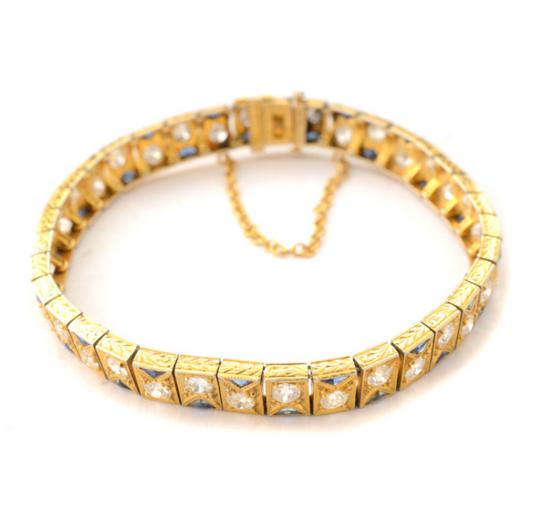 Diamond, Synthetic Sapphire, Yellow Metal Bracelet