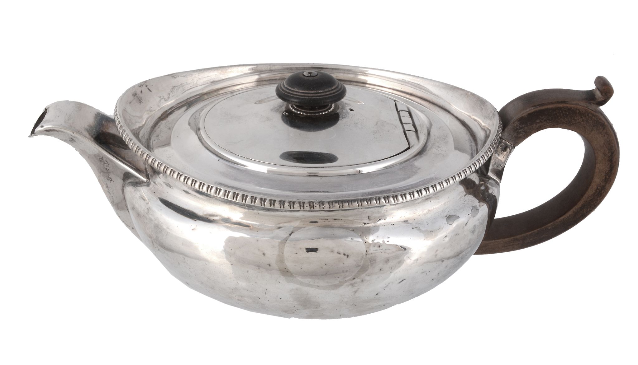 with a turned wood finial and loop handle, a nulled rim, on a threaded collet foot, 27cm (10 1/2in) long, 654g (21 oz)