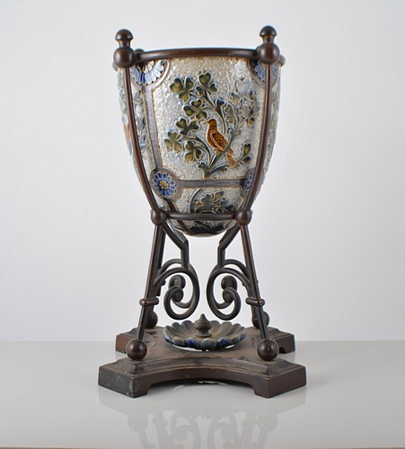 by Mark V Marshall, decorated with bats, on a metal stand of scroll supports and bead terminations on a concave square base