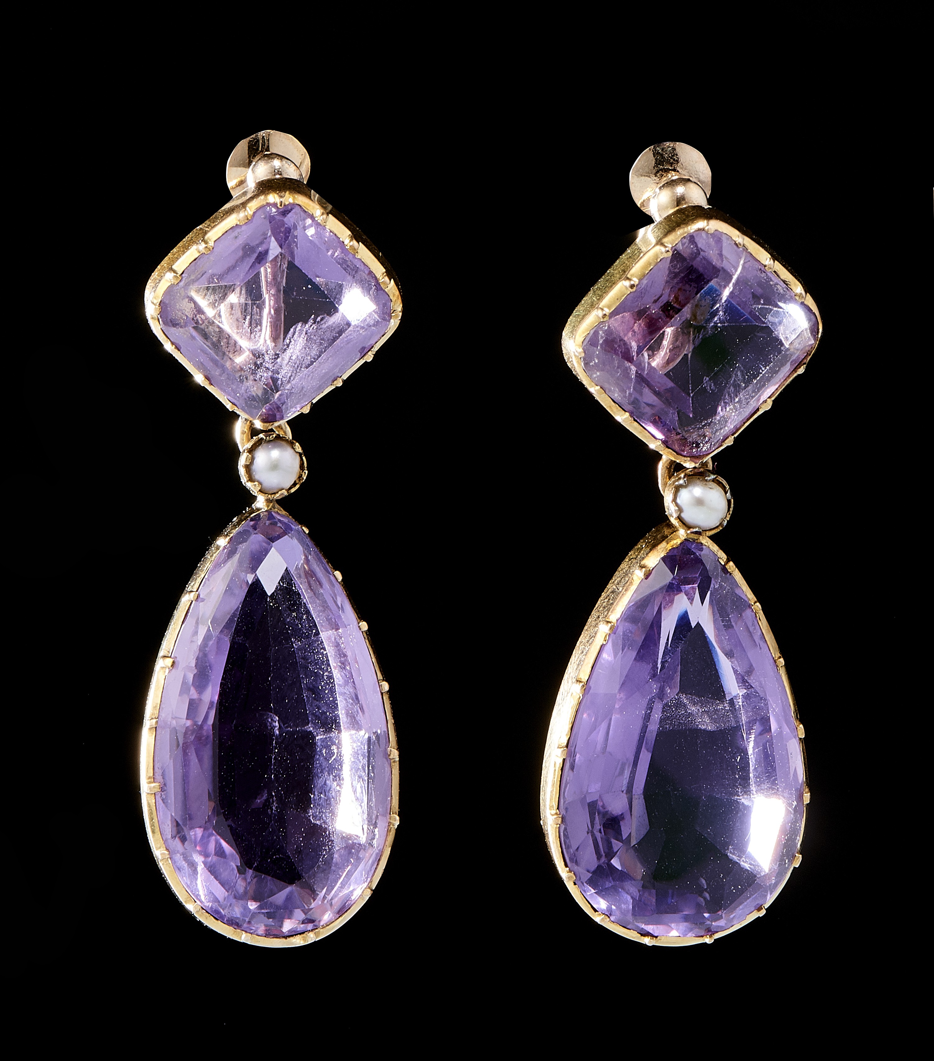 Drop earrings holding drops of pear-cut amethysts surmounted by square-cut amethysts