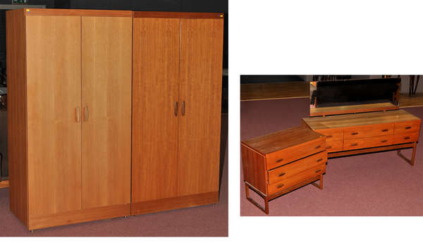 a teak four-piece 'Quadrille' pattern bedroom suite, c.1960's, comprising: two wardrobes