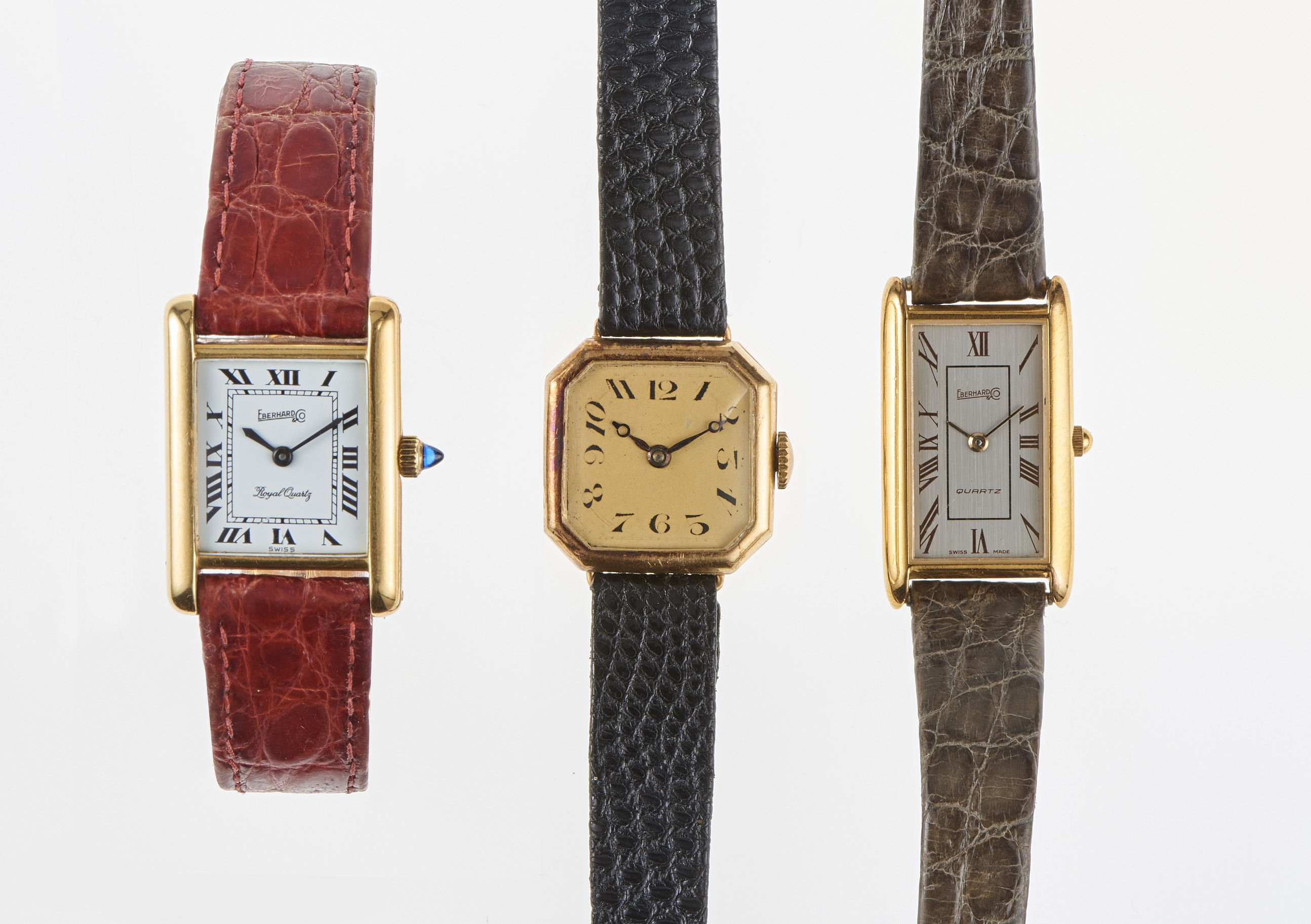 One gray dial, gold hands and Roman numerals, steel and gold metal, 31x18 cm, and the other white dial, hands and black Roman numerals, crown set with a sapphire, gold metal, 28x21 mm