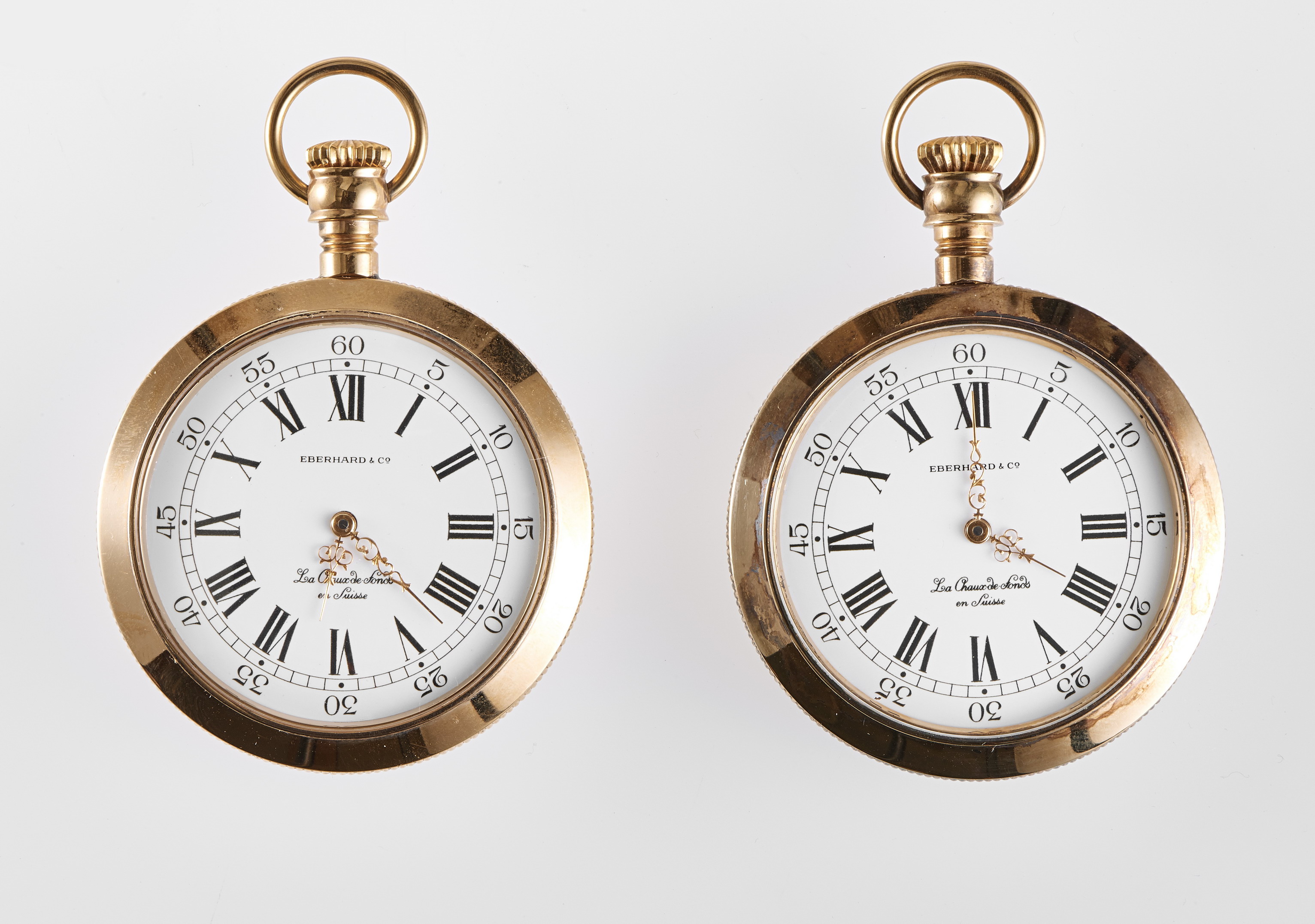 Eberhard, La Chaux-de-Fonds, lot of two pocket watches decorated with portraits of women painted on the reverse