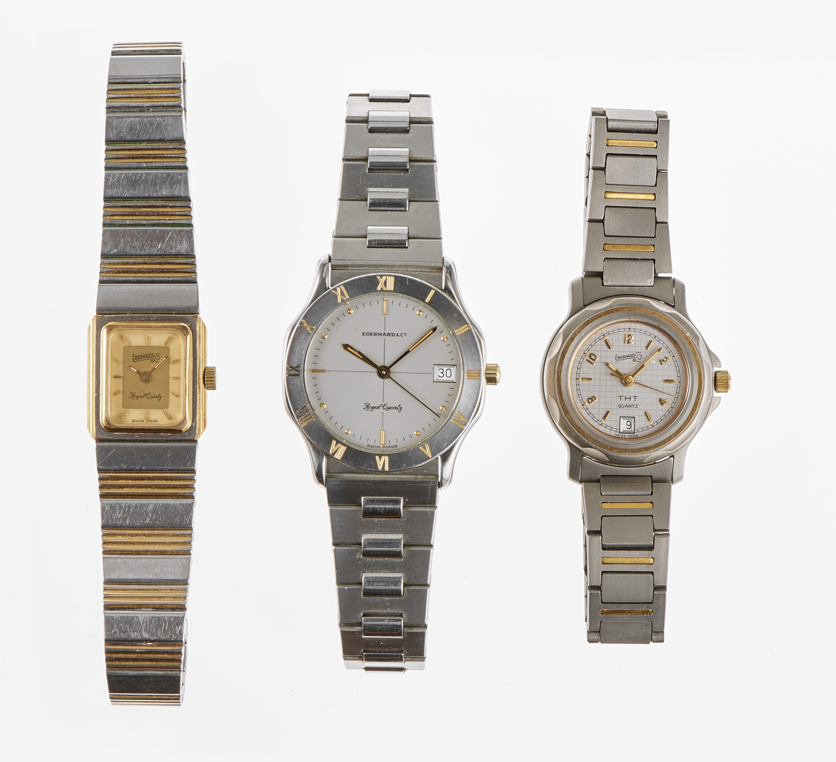 One with a black dial, gold hands, date window at 3 o'clock, steel, D 30 mm, one with a gray dial, hands, roman numerals and gold-plated indexes, date window at 3 o'clock, steel, D 30 mm and the third with a gray dial, gold hands and Arabic numerals,