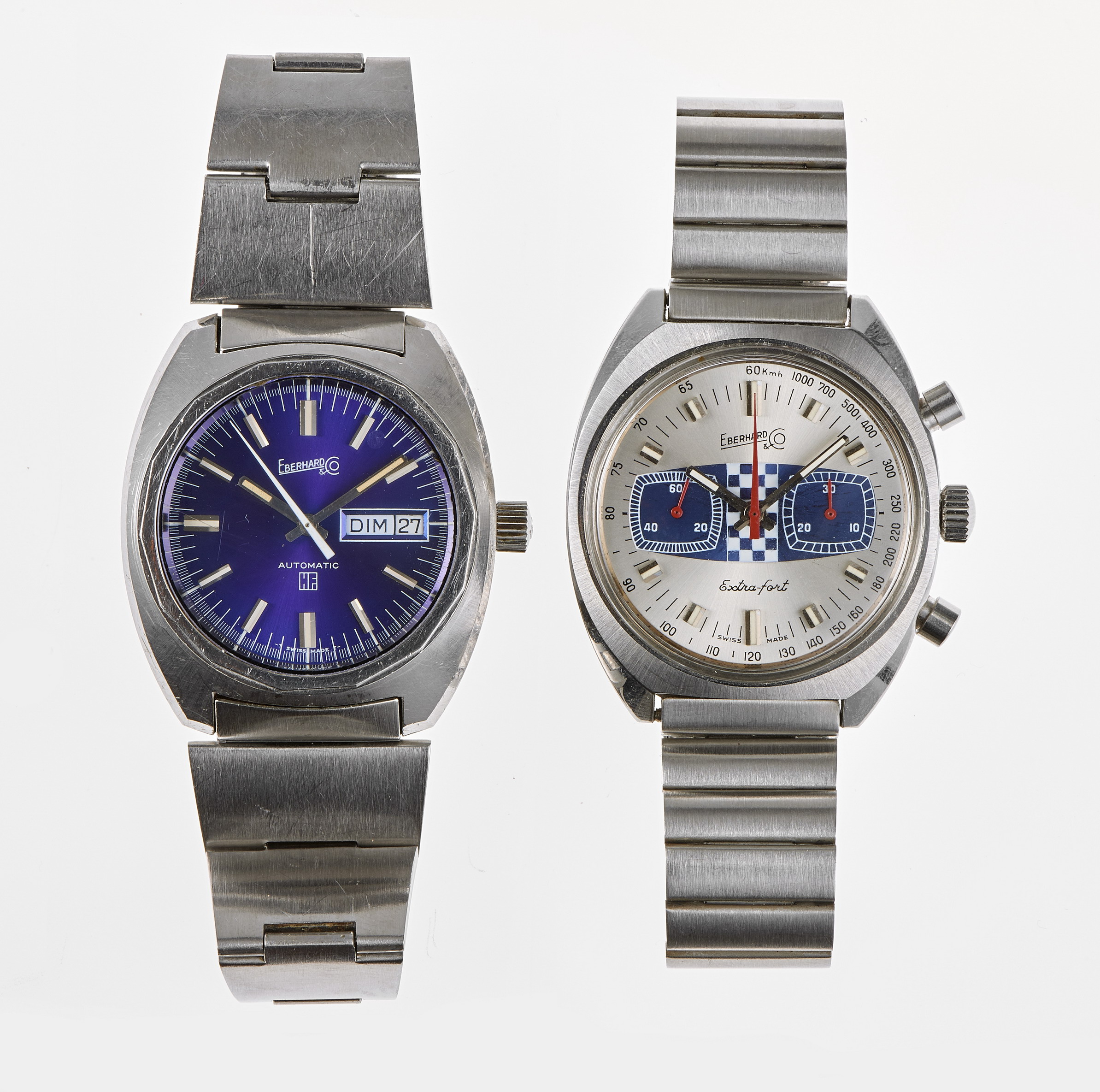 One automatic dial with violet dial, luminescent gray hour markers and indexes, date and date at 3 o'clock, steel, D 34 mm, the other mechanical with a gray dial, gray luminescent hands and baton hour markers, red second hand, steel, D 34 mm